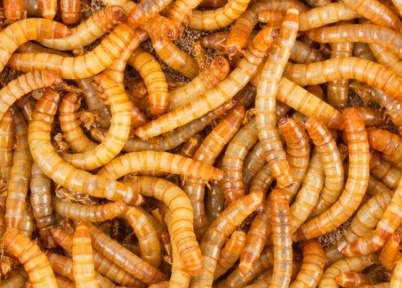 Caja de aproximadamente 500 gramos de Tenebrio molitor vivo, conocido como gusano de la harina, ideal como alimento vivo para reptiles, aves, peces y otros animales insectívoros.